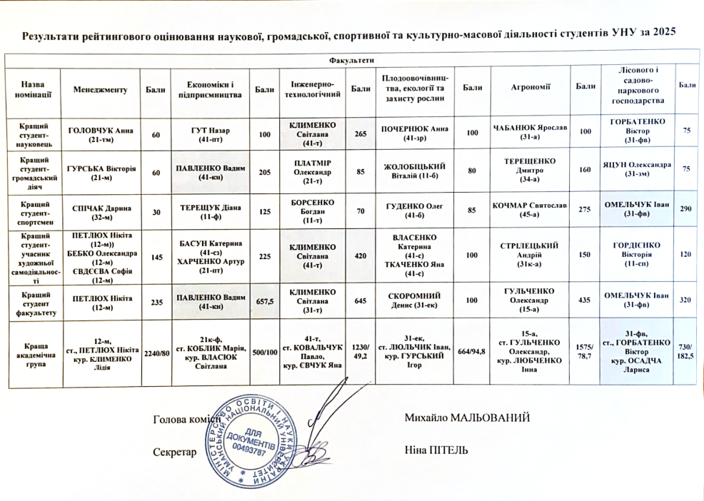 Старосту групи Гульченко Олександра визнано кращим студентом факультету агрономії. Його відповідальність, організаторські здібності, активна участь у спортивному та громадському житті університету є прикладом для інших студентів.