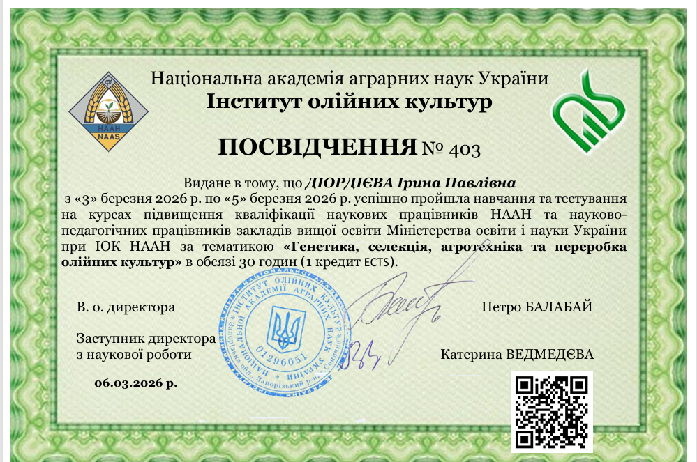 Не лише наші студенти, а й викладачі постійно навчаються та підвищують свій професійний рівень. Зокрема, доцент кафедри генетики, селекції рослин та біотехнології Уманського національного університету Діордієва Ірина Павлівна з 3 по 5 березня 2026 року успішно пройшла навчання та тестування на курсах підвищення кваліфікації наукових працівників НААН та науково-педагогічних працівників закладів вищої освіти Міністерства освіти і науки України при ІОК НААН за тематикою "Генетика, селекції, агротехніка та переробка олійних культур" в обсязі 30 годин (1 кредит ECTS).